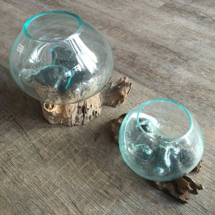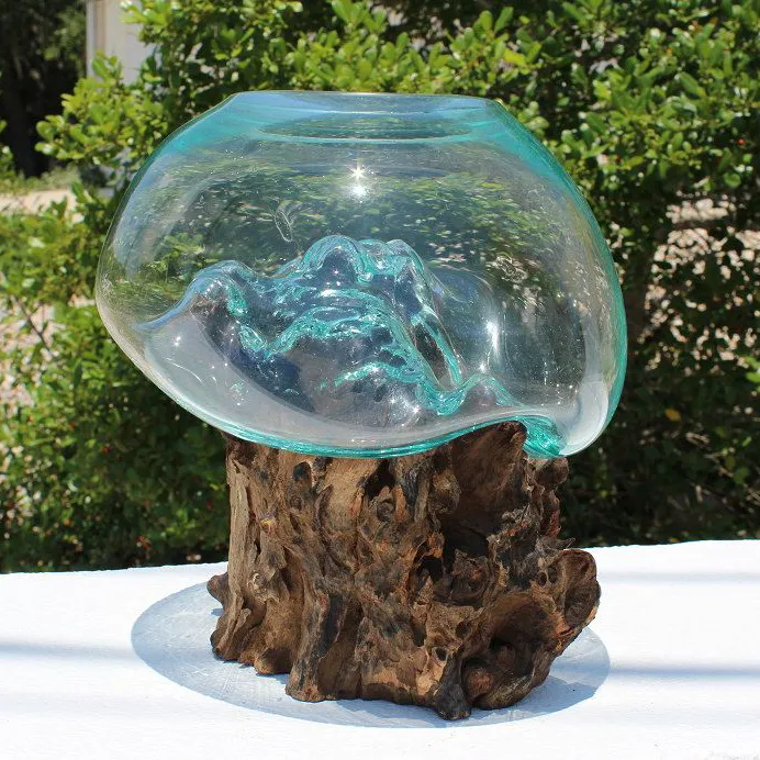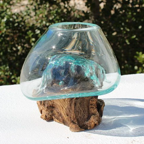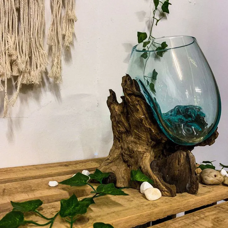 Handcrafted in Bali, this melted glass decorative bowl, vase, and terrarium planter is made from recycled glass and natural Gamal root wood. The hand-blown molten glass is carefully shaped over the wood while hot, creating a perfect, organic fit. Each piece is truly one of a kind, blending earthy textures with modern elegance—ideal for air plants, stones, cut flowers, or as a unique decorative accent.